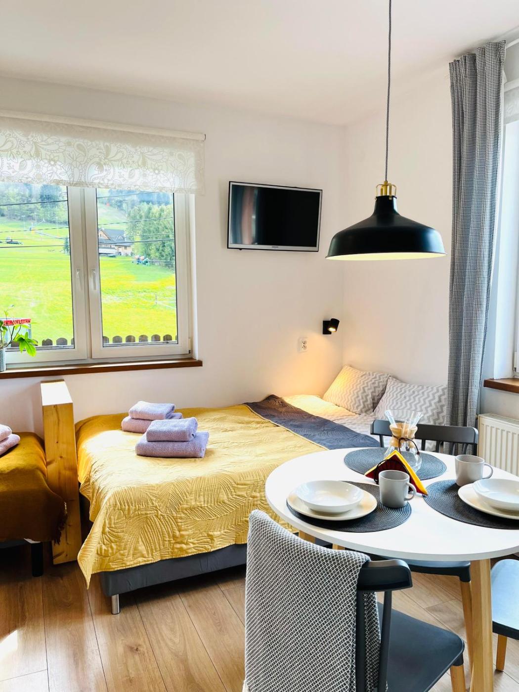 Apartament typu studio. This apartment comprises 1 bedroom, a kitchenette and 1 bathroom with a shower and a hairdryer. Meals can be prepared in the well-fitted kitchenette, which comes with a stovetop, a refrigerator, kitchenware and a microwave. This apartment features a tea and coffee maker, flat-screen TV, mountain views, as well as chocolate for guests. The unit offers 2 beds. Apartament - 3 osobowy. Powierzchnia pokoju ok.: 22 mkw.